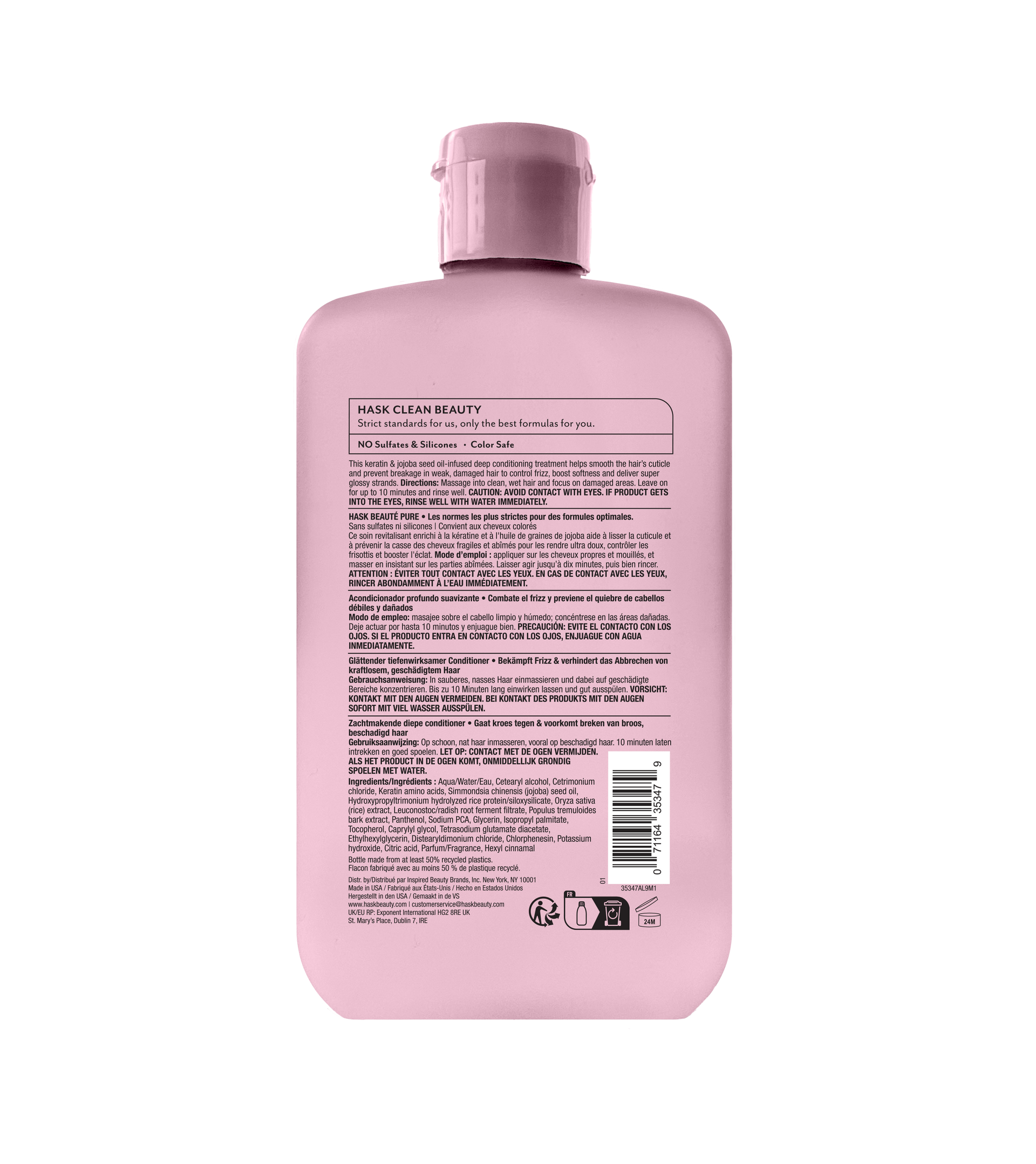 Free of sulfates, parabens, phthalates, silicone, gluten, drying alcohol and artificial colors. Cruelty free and color-safe. Aqua/Water/Eau, Cetearyl alcohol, Cetrimonium chloride, Keratin amino acids, Simmondsia chinensis (jojoba) seed oil, Hydroxypropyltrimonium hydrolyzed rice protein/siloxysilicate, Oryza sativa (rice) extract, Leuconostoc/radish root ferment filtrate, Populus tremuloides bark extract, Panthenol, Sodium PCA, Glycerin, Isopropyl palmitate, Tocopherol, Caprylyl glycol, Tetrasodium glutamate diacetate, Ethylhexylglycerin, Distearyldimonium chloride, Chlorphenesin, Potassium hydroxide, Citric acid, Parfum/Fragrance, Hexyl cinnamal